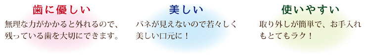 ピッタリとお口に合った良く噛める入れ歯を製作でき、金属のバネを使わないので歯に優しく、取り扱いもとってもラクな入れ歯が完成します。